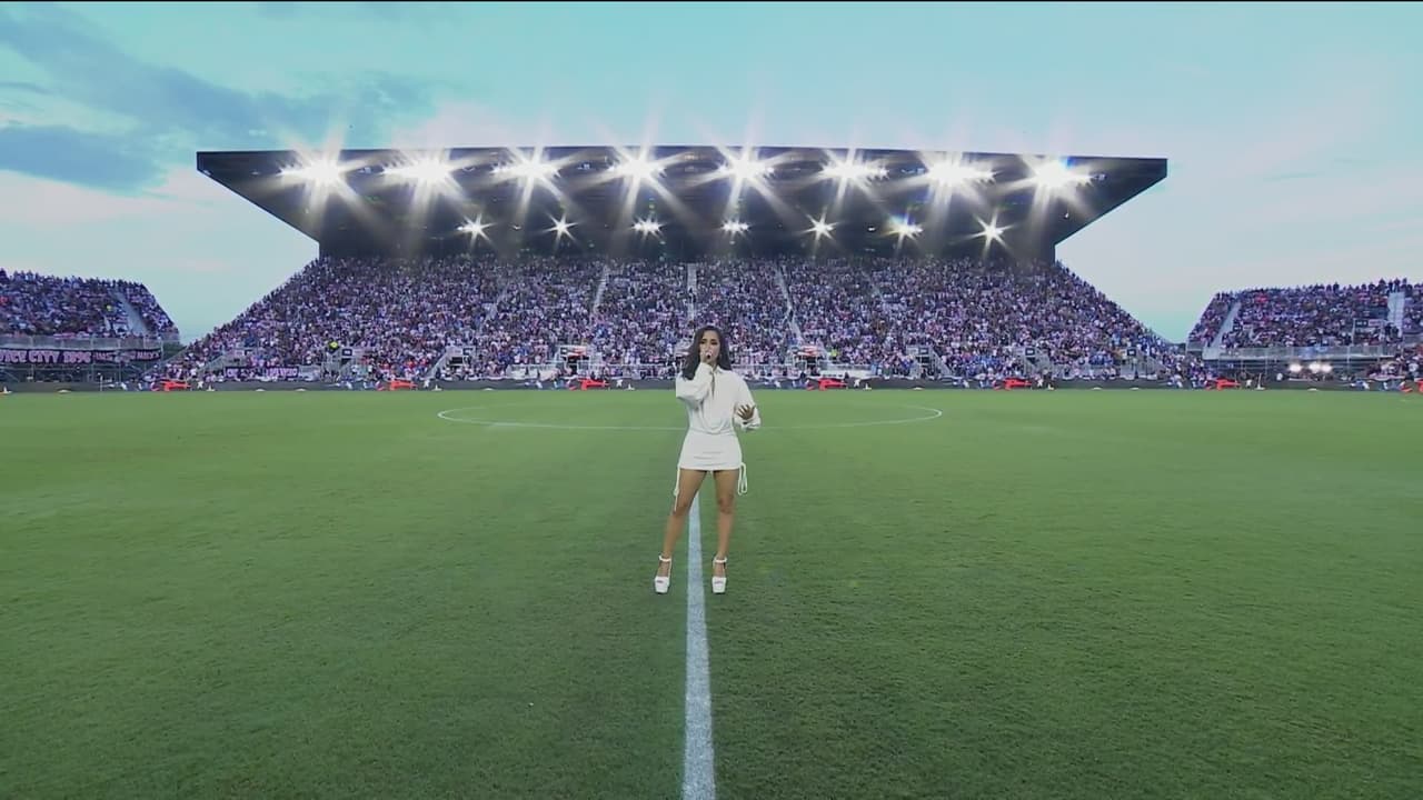 Con respeto y emoción, Becky G fue la encargada de los acordes previo al cotejo entre Inter Miami y Cruz Azul de la Leagues Cup.