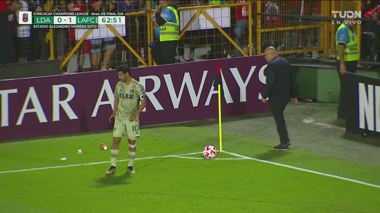 El capitán del LAFC estaba por hacer el saque de esquina, pero no oculta su furia ante el lanzamiento de proyectiles.