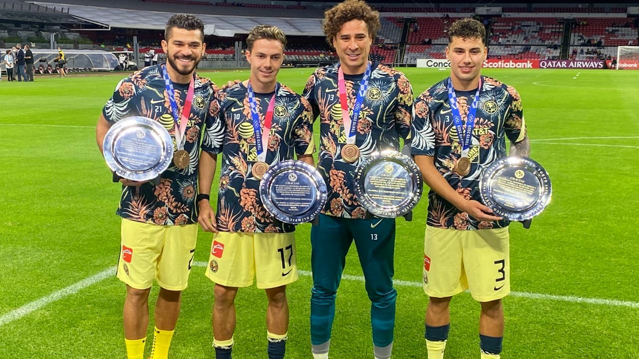 Henry Martín, Memo Ochoa, Jorge Sánchez y Sebastián Córdova recibieron un reconocimiento po parte del América con motivo de haber ganado la medalla olímpica para México en Tokyo 2020 en la cancha del Estadio Azteca, previo a la Semifinal de ida de la Liga de Campeones de la Concacaf ante el Philadelphia Union.