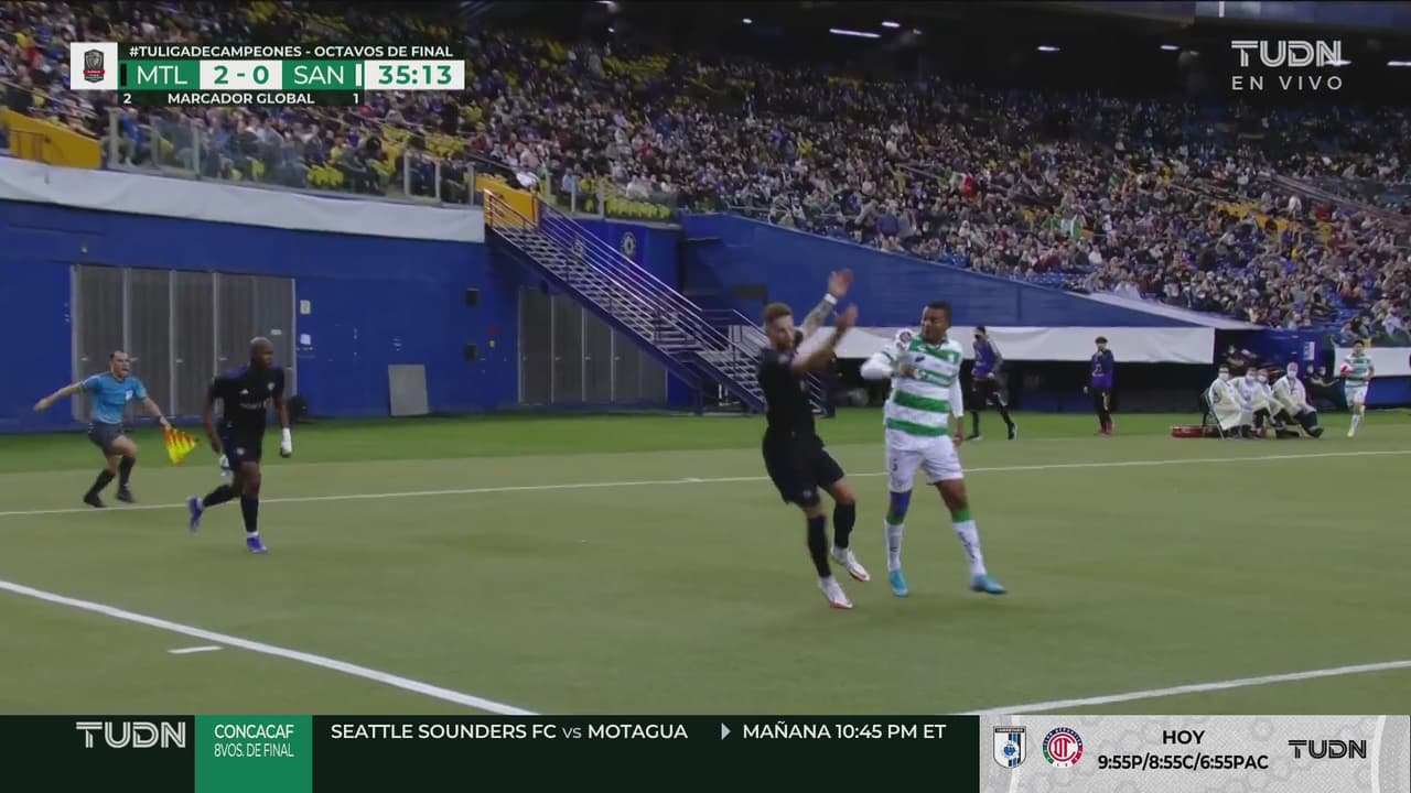 El delantero del Santos empujó por la espalda al defensa de CF Montreal, por lo que se llevaron la amarilla.