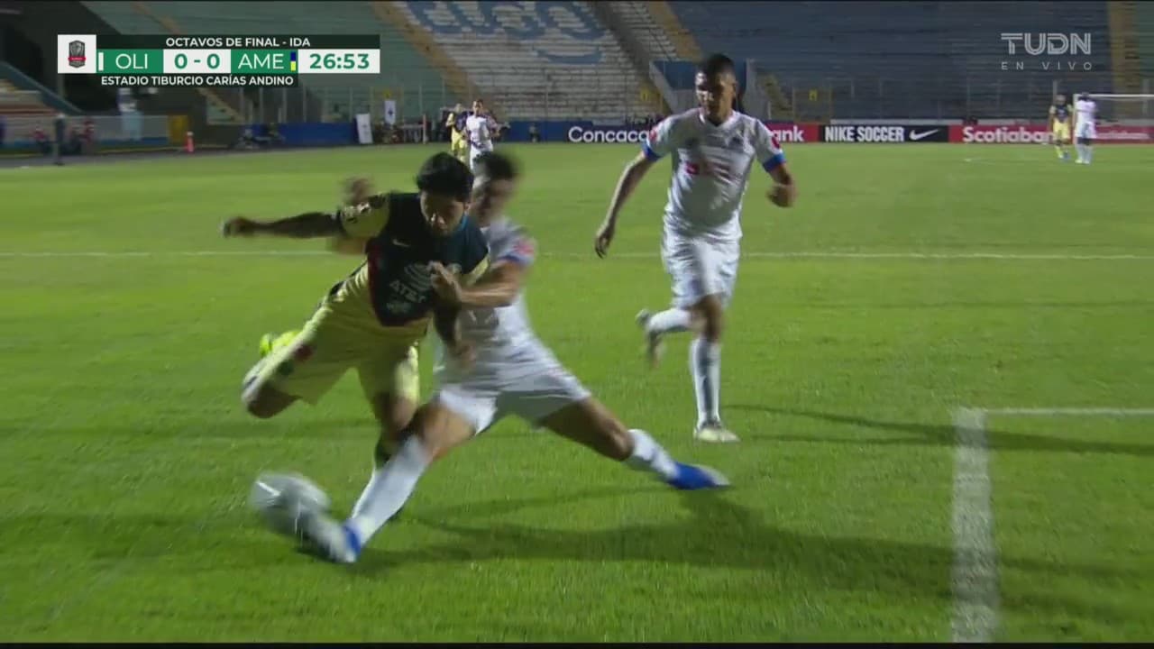 El jugador del América se internó al área, quería driblar, pero fue detenido en seco al 27’.