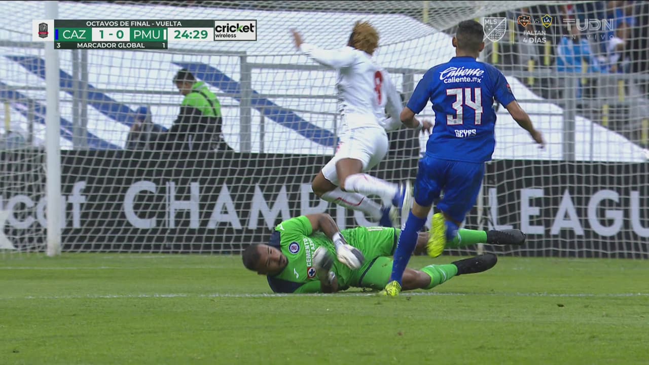 Balón a profundidad para el ‘8’ visitante, alcanzó a puntear el balón, el portero del Cruz Azul lo barrió, pero el árbitro dijo que era limpia al 24’.