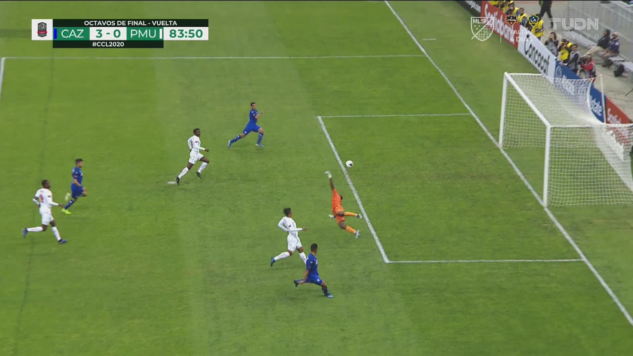 El delantero del Cruz Azul intentó bombear ante el achique del portero del Portmore, quien alcanzó a desviar al 84’.