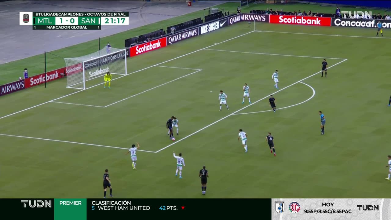 ¡Gol! CF Montreal 2| Santos Laguna 0. Djordje Mihailovic (CF Montreal) zurdazo desde el lado izquierdo dentro del área por el centro del arco. Asistencia de Romell Quioto.