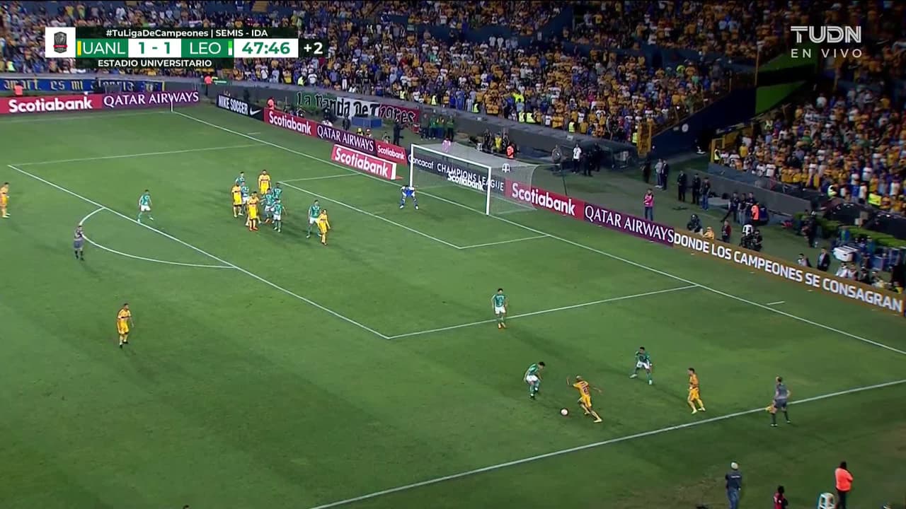 ¡Gol! Tigres 2| León 1. Luis Quiñones (Tigres) zurdazo desde el centro del área al centro de la portería. Asistencia de Samir con un pase de cabeza tras un saque de esquina.