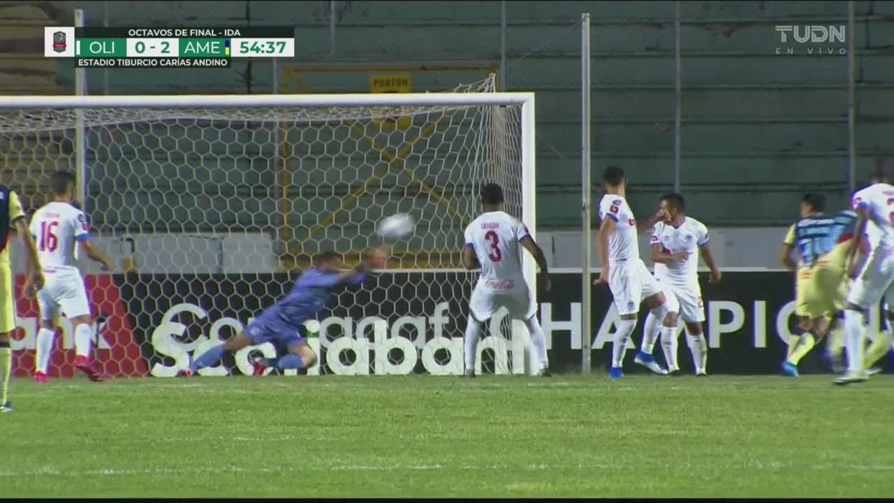 El defensa del América se agregó al ataque en un tiro de esquina, pero el portero manoteó al 54’.