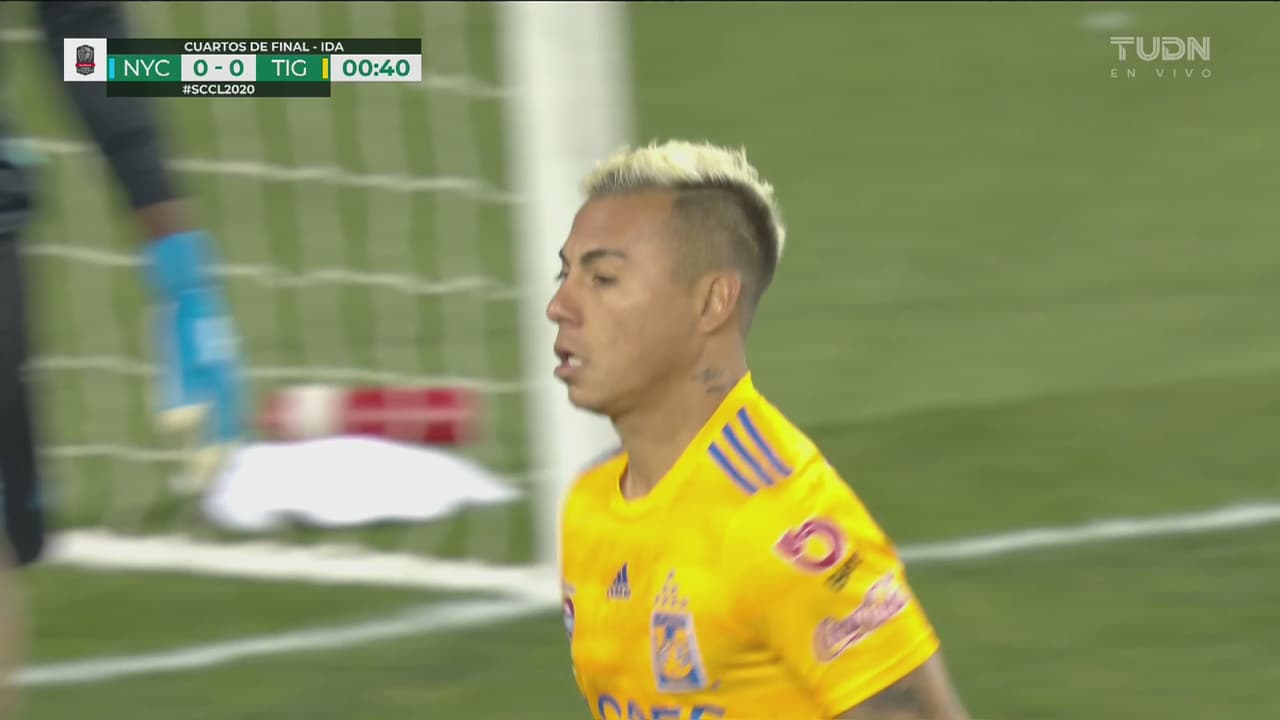 El delantero de Tigres aprovechó el error de la defensa contraria y estuvo a punto de convertir el primer gol del partido.