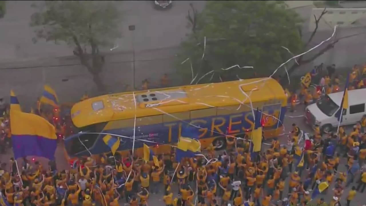 Cientos de hinchas esperaron el bus de los 'Felinos' para acompañar a los jugadores con arengas, cánticos y pólvora, horas previas a la final de ida de la Liga de Campeones de la Concacaf frente a Rayados.