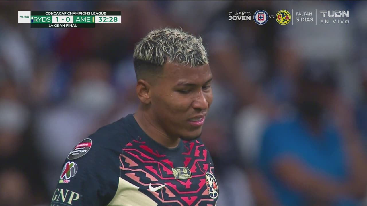 El delantero del América entra por el costado izquierdo, pega el zapatazo y se va desviado, al 32'.
