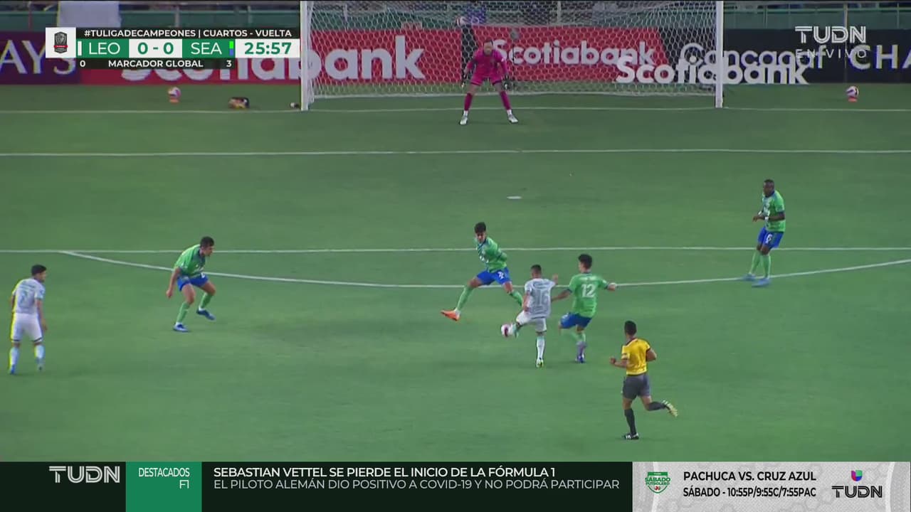 El atacante de León se encuentra un espacio y se anima con un cañonazo que termina en el portero.