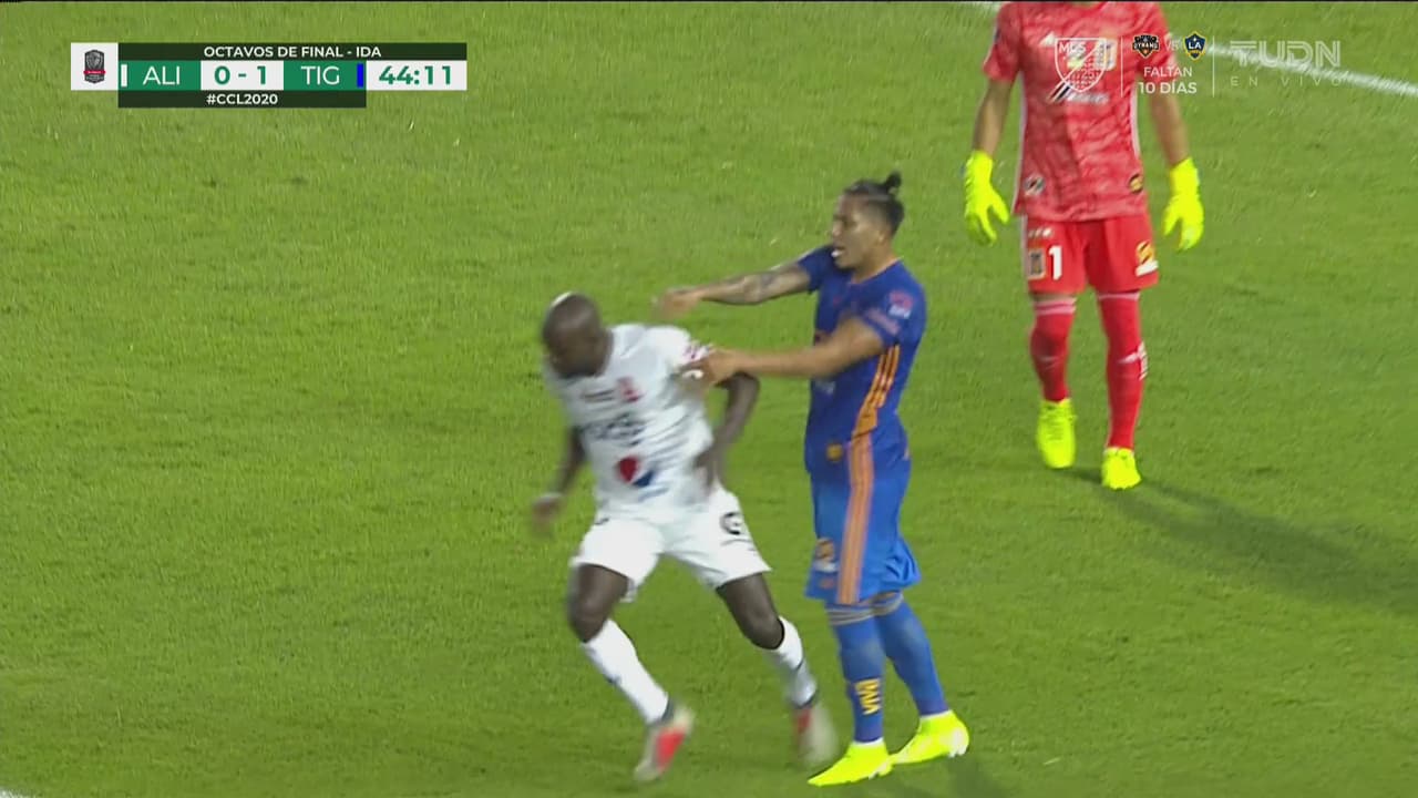 Oswaldo Blanco primero le entró con fuerza a Nahuel Guzmán, después desequilibró a Carlos con el cuerpo y este se levantó a manotearlo al 44’.