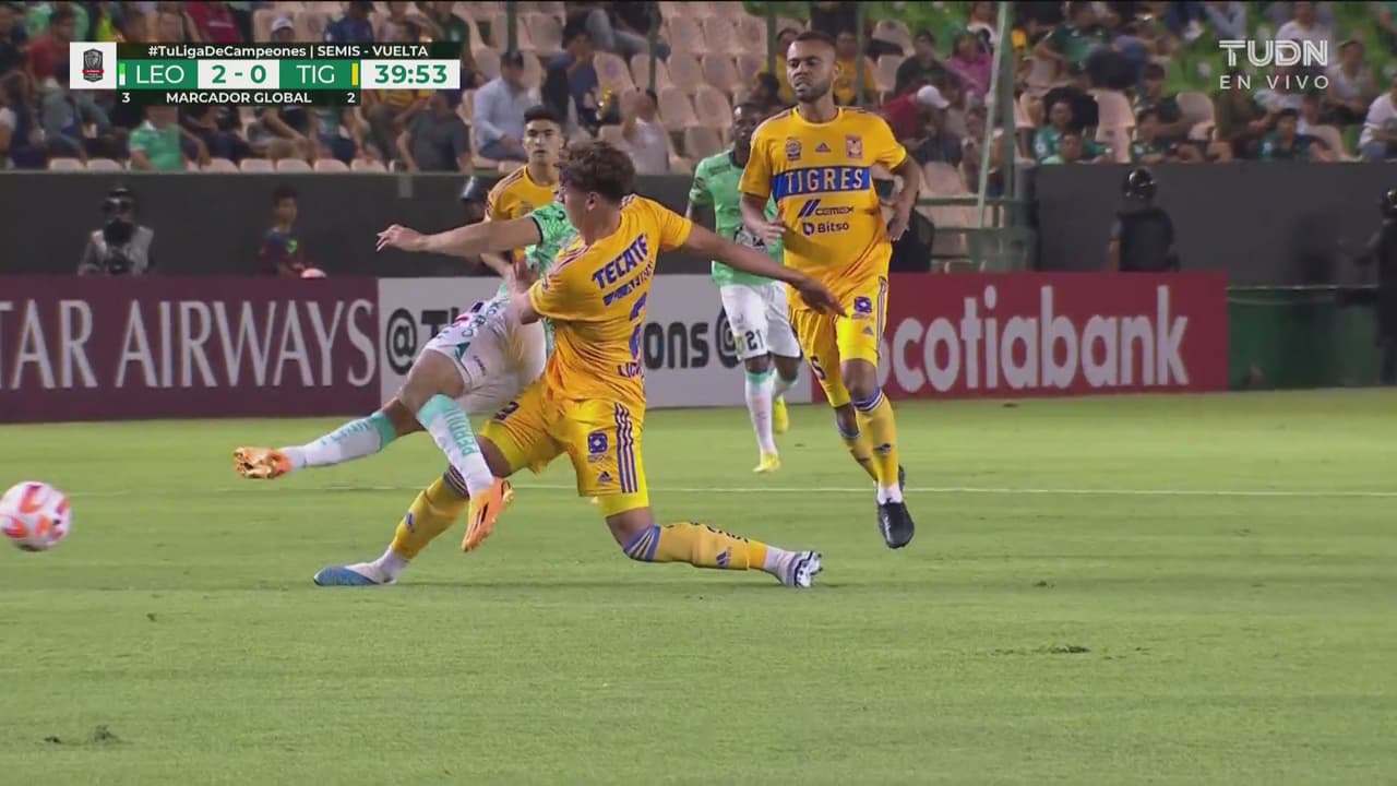 El defensor de Tigres aprovechó un balón dividido para llevarse al delantero de León en una jugada que era falta y amarilla.