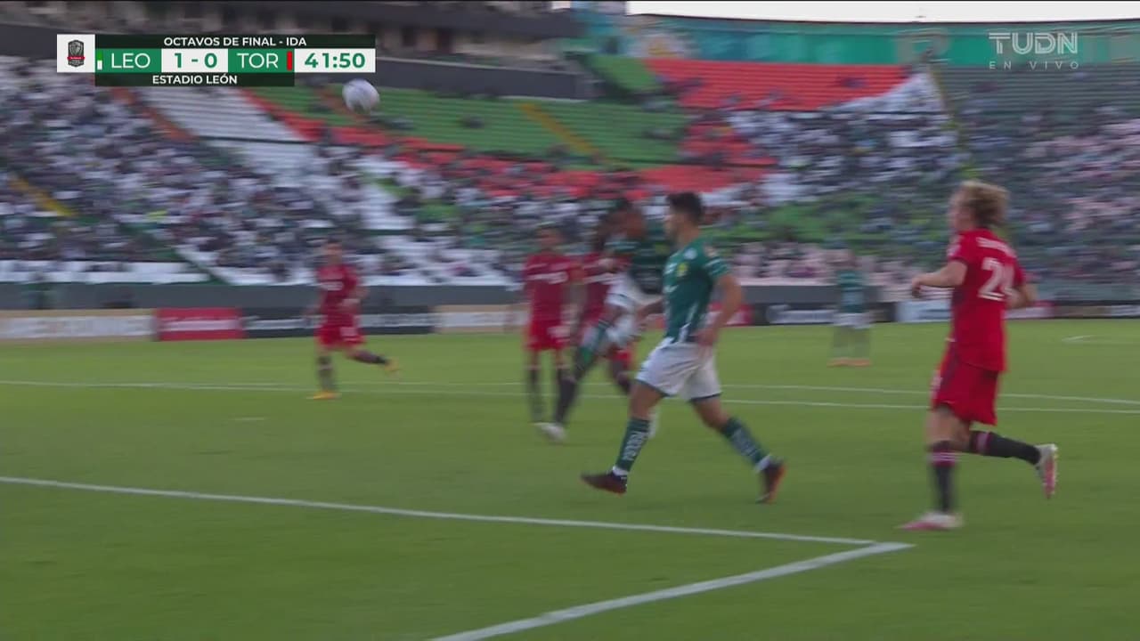 El colombiano remata de cabeza, pero Omar se cruza de manera salvadora, al 42’,