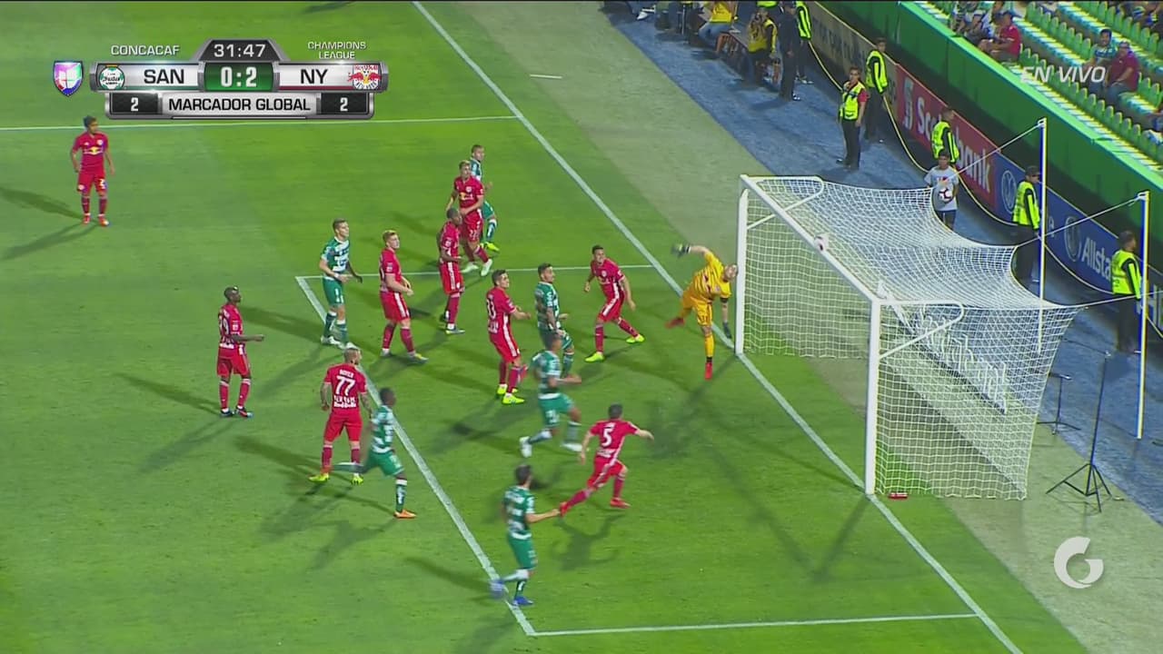El central argentino de los laguneros hizo un gran remate con la testa en un tiro de esquina y por poco marca el primero de no ser por el palo horizontal que salvó a Red Bulls.