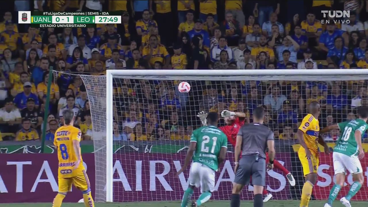 El defensor de León se sumó al frente y metió un tiro que amenazaba con colarse en el ángulo, pero el arquero de Tigres lo evitó.