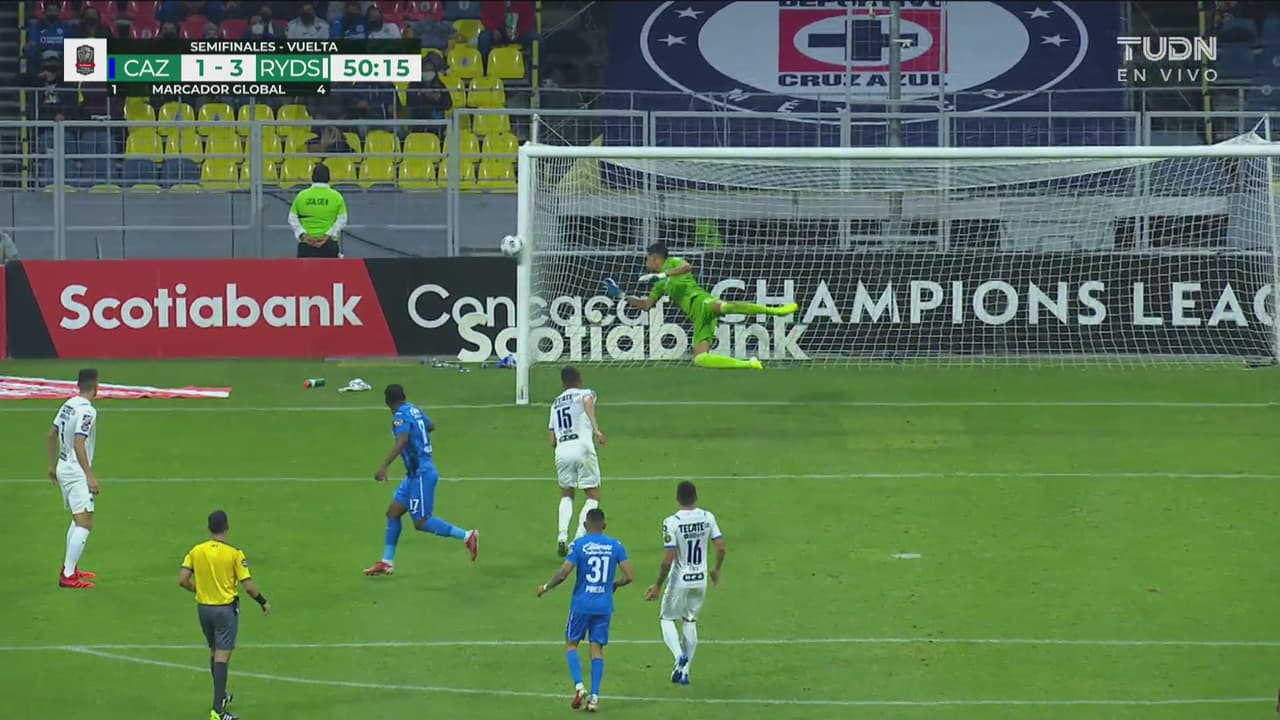 Esteban Andrada voló, pero el balón se estrelló en el poste y se salvó Rayados al 50’.