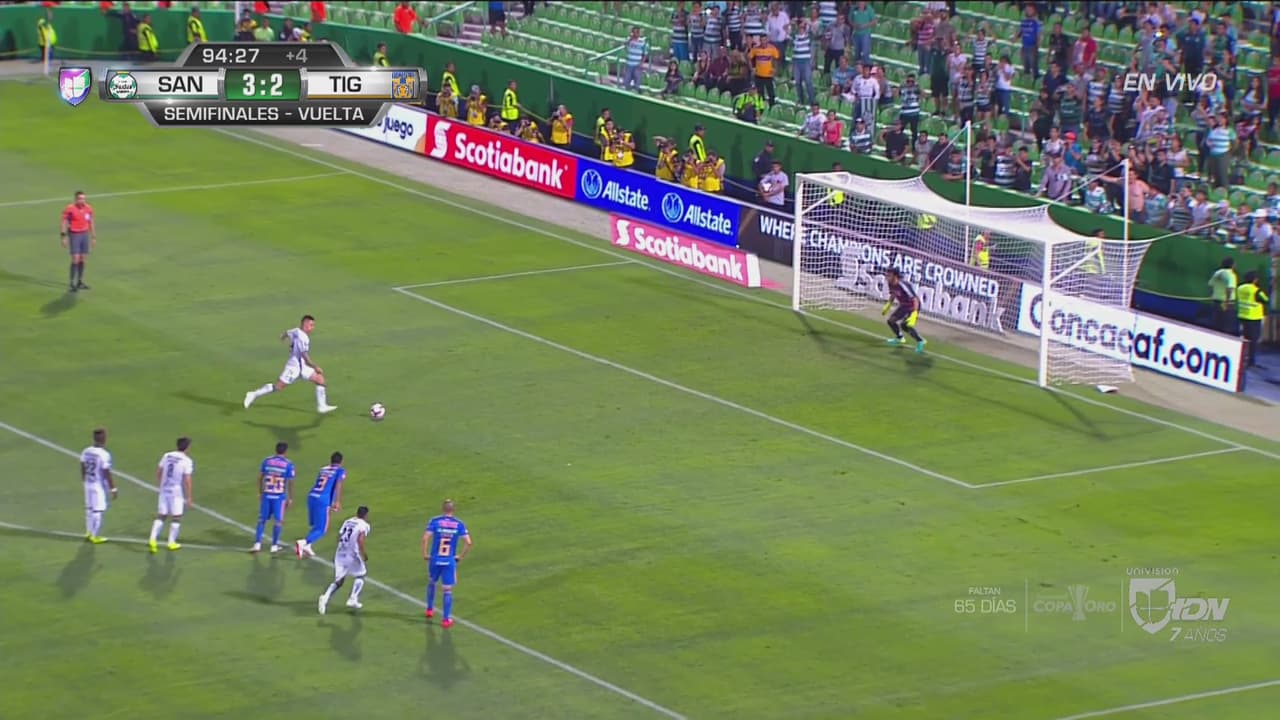 Cuando se jugaba el tiempo agregado el árbitro marcó una pena máxima inverosímil que cobró Correa reventando el travesaño y así acabó el juego con victoria de Santos y pase de Tigres.