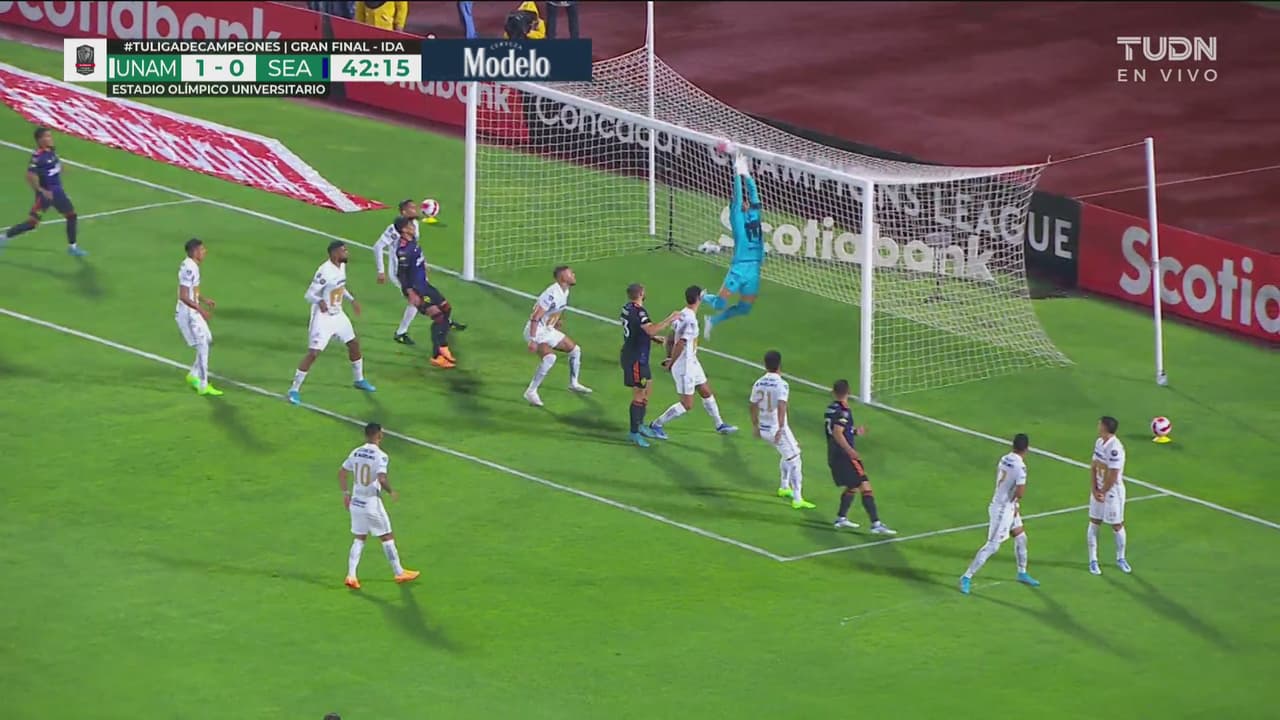 A partir de ese momento, Pumas bajó la intensidad y Seattle fue creciendo de a poco hasta que encontró el descuento en un centro que pegó en la mano de un zaguero de Pumas, el árbitro no dudó en marcar el penal y Nico Lodeiro no falló pese a que Talavera adivinó, alcanzó a rozar el baló, pero terminó yéndose al fondo de su portería.