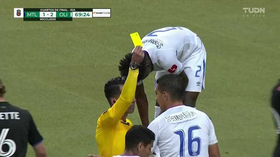 Tarjeta amarilla. El árbitro amonesta a Johnny Leverón de Olimpia de Tegucigalpa on March 10, 2020