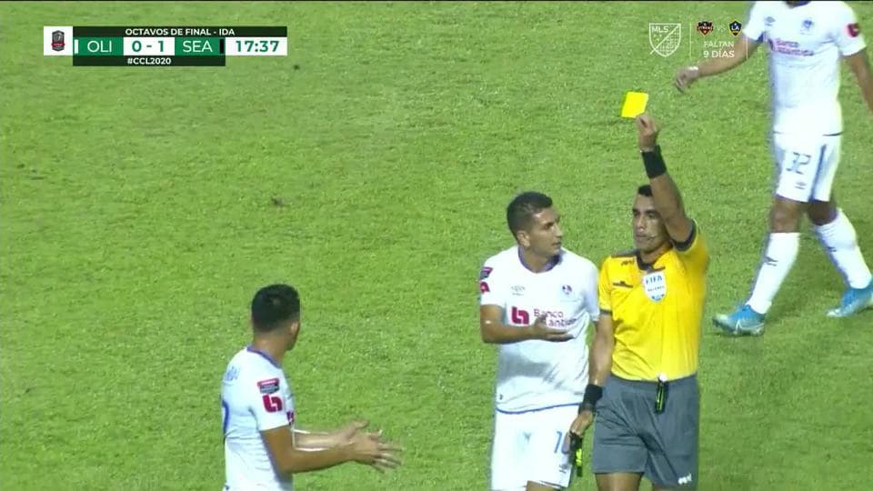 Tarjeta amarilla. El árbitro amonesta a Jonathan Paz de Olimpia de Tegucigalpa