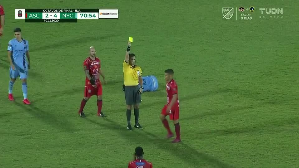 Tarjeta amarilla. El árbitro amonesta a Marcos Mena de San Carlos on February 20, 2020