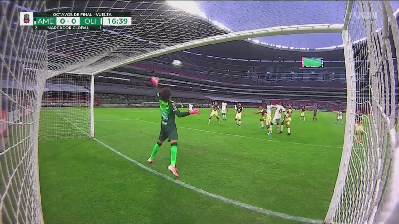 El delantero del Olimpia asustó a Memo Ochoa con su remate potente durante el tiro libre al 15’.