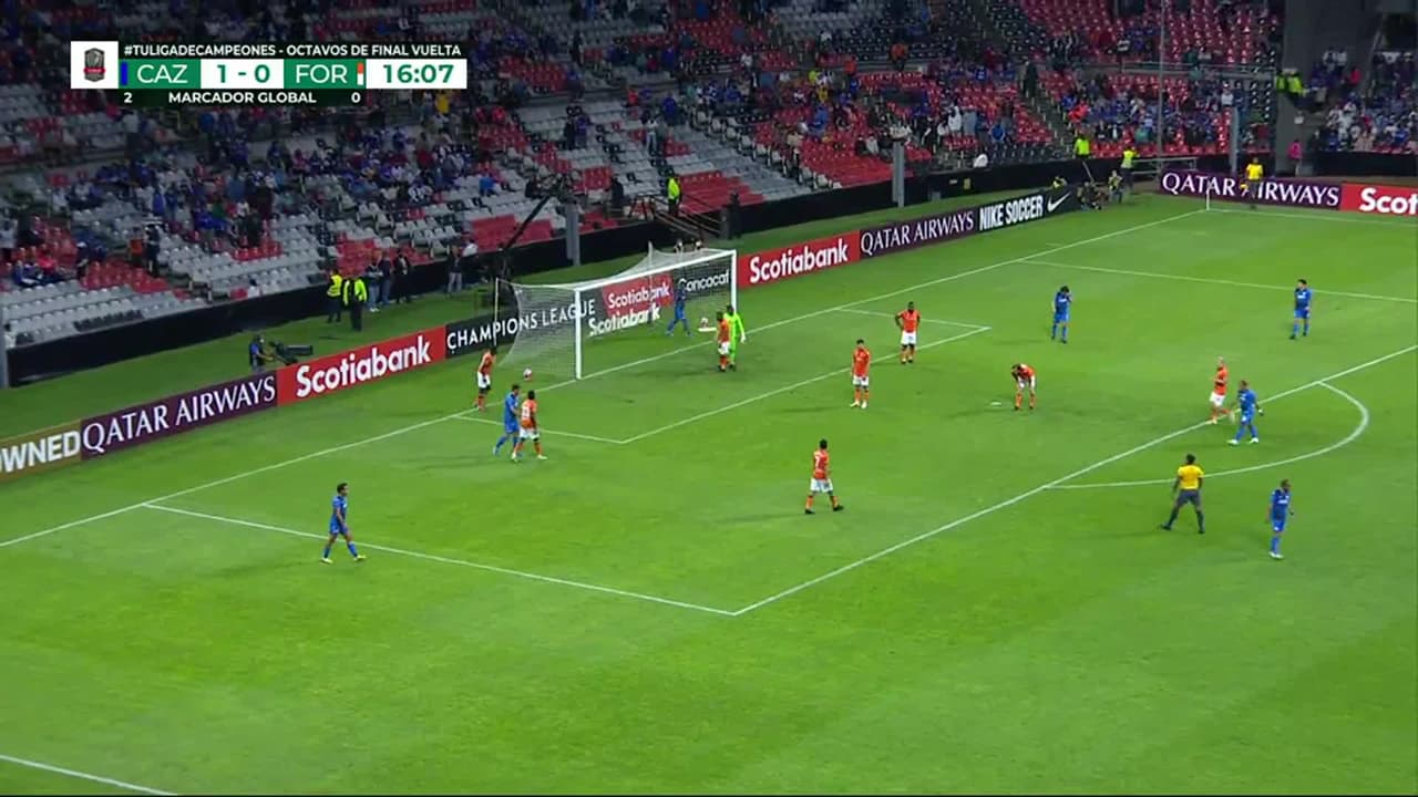 Tiro atajado por abajo a la izquierda. Ángel Romero (Cruz Azul) zurdazo desde fuera del área. Asistencia de Rómulo Otero.