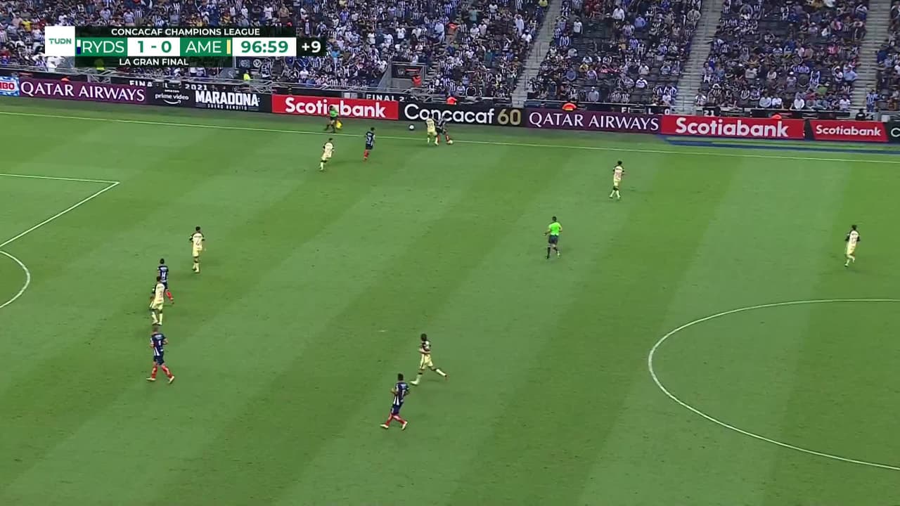 Tiro atajado raso al centro del arco. Érick Aguirre (Monterrey) zurdazo desde el lado izquierdo dentro del área.