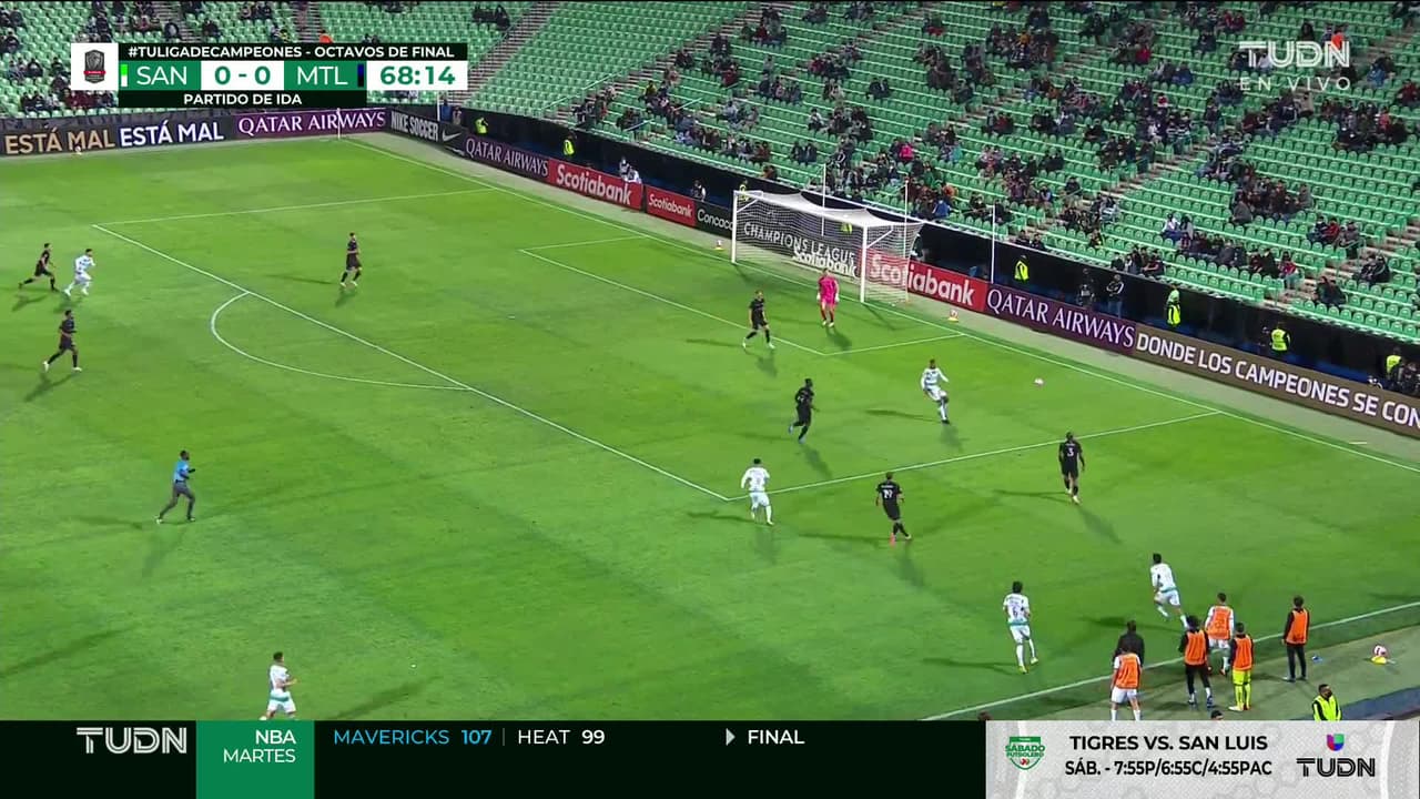 Tiro atajado junto al lado derecho de la portería. Leonardo Suárez (Santos Laguna) zurdazo desde el lado derecho dentro del área. Asistencia de Alan Cervantes.