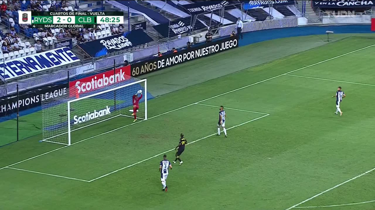 Tiro atajado. Maximiliano Meza (Monterrey) Disparo con la derecha desde fuera del área.
