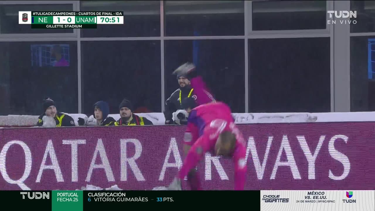 Tiro atajado. Rogério (Pumas UNAM) disparo de cabeza a quemarropa desde el lado derecho.