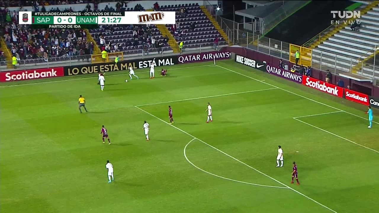 Tiro atajado. Sebastián Saucedo (Pumas UNAM) Disparo con la derecha desde fuera del área.