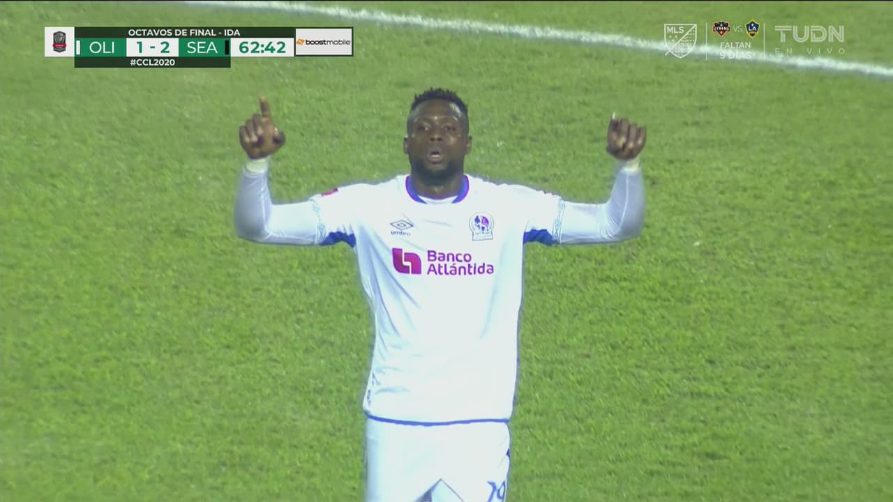 El delantero del cuadro hondureño se encuentra el balón en el área y con un derechazo fulmina al arquero del Seattle Sounders.