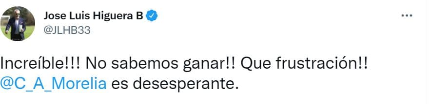 "¡Increíble! ¡No sabemos ganar! ¡Qué frustración! Atlético Morelia es desesperante", explotó en Twitter.