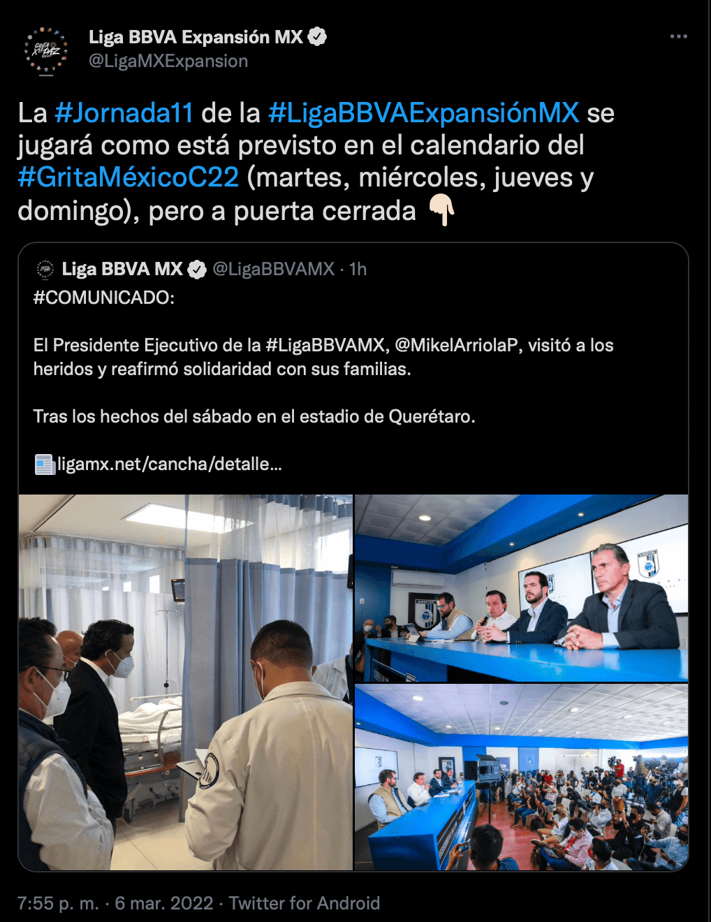 Mikel Arriola, presidente de la Liga MX, vistió a los heridos que están hospitalizados tras la trifulca del Estadio Corregidora y ahí destacó algunos puntos sobre las tres principales divisiones el el futbol mexicano.