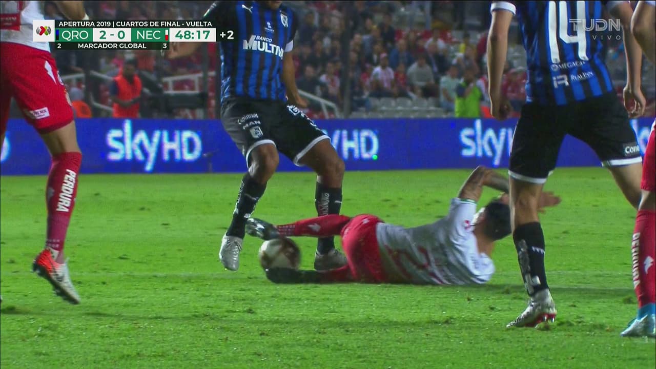Fernando Hernández recurre al videoarbitraje y determina que la falta del defensa del Querétaro sobre Claudio Baeza amerita la tarjeta roja.