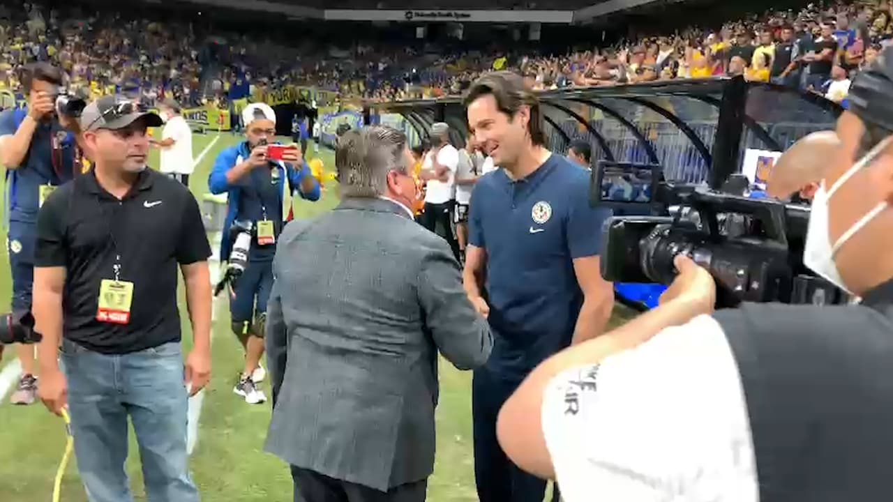 Miguel Herrera, ya como DT de Tigres, fue a saludar a Santiago Solari a la banca del América en una imagen para el recuerdo.