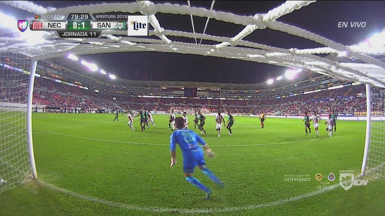 Luego de un gran cobro de tiro libre directo por parte de Matías Fernández de Necaxa, el arquero de Santos recostó el disparo y, a 10 del final, mantuvo la ventaja de 1-0.