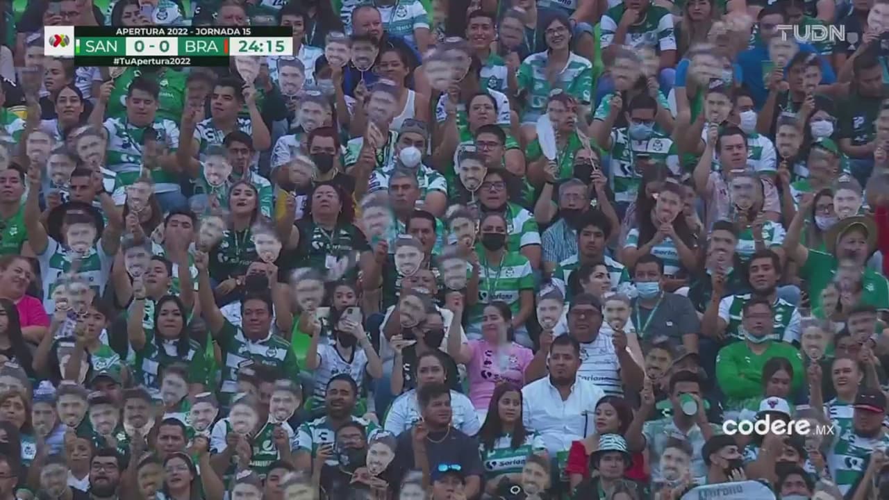 Fue sobre el minuto 24 que los seguidores albiverdes mostraron una máscaras de papel con el rostro de Oribe Peralta, fue en ese minuto, pues es el número que el exdelantero portó e hizo referencia con los laguneros.