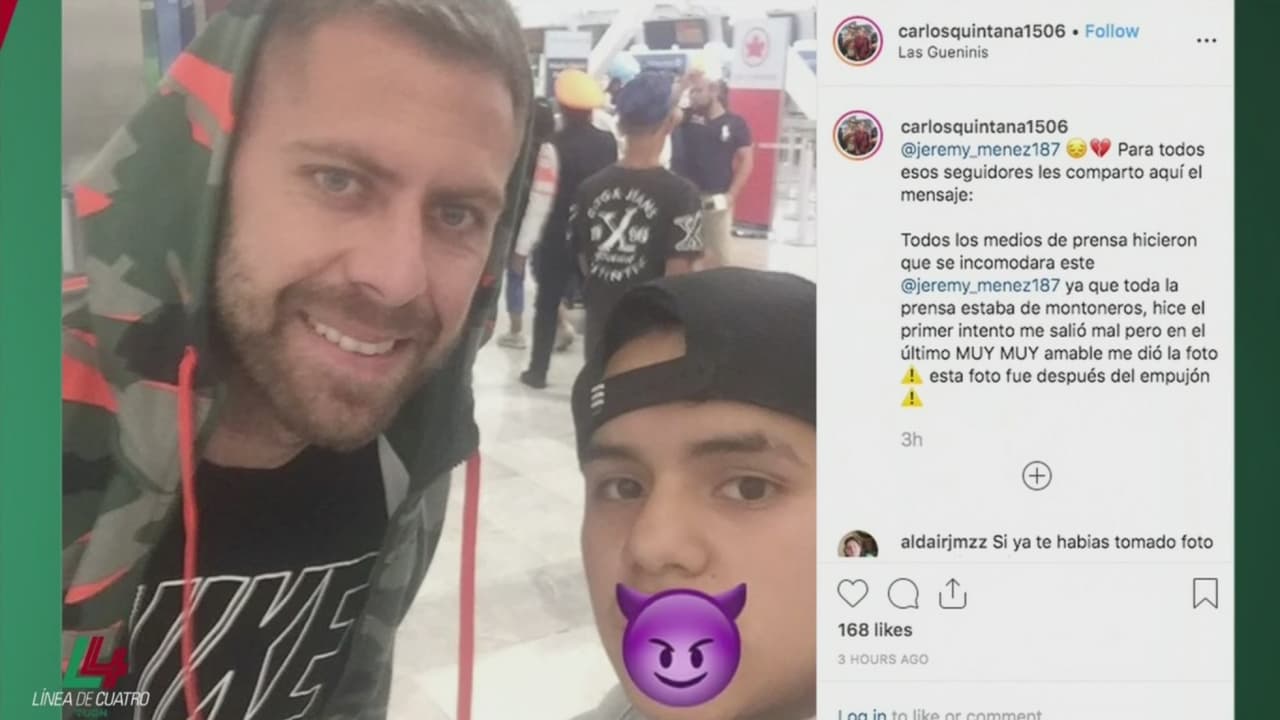 Carlos Quintana es el presunto aficionado que fue empujado por Ménez cuando le solicitaba una fotografía instantes después de que fuera asediado por la prensa que acudió por unas palabras del jugador instantes previos a que abandonara México.