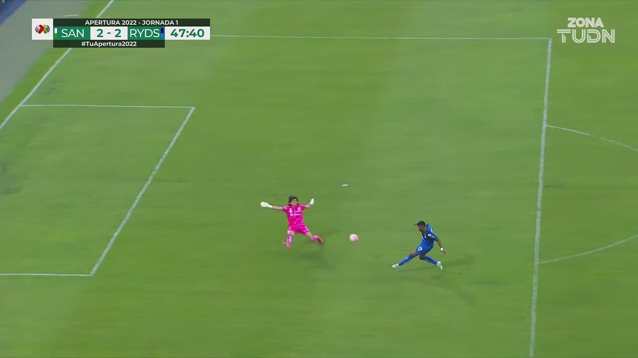 Balón filtrado para Rodrigo, quien encaró al portero del Santos y disparó por arriba; estaba adelantado.