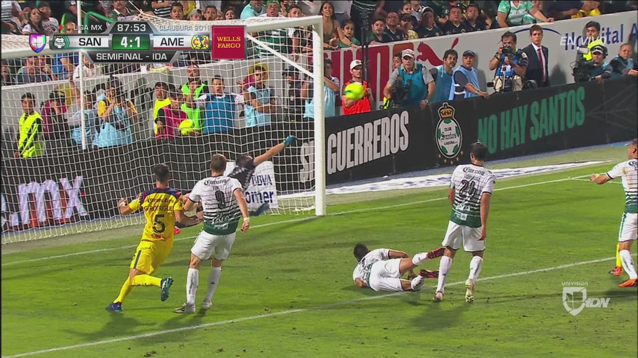 El portero del América voló al cabezazo de Jesús Isijara y ahogó un nuevo grito de gol para Santos. El 5-1 hubiera sido lapidario para las Águilas.