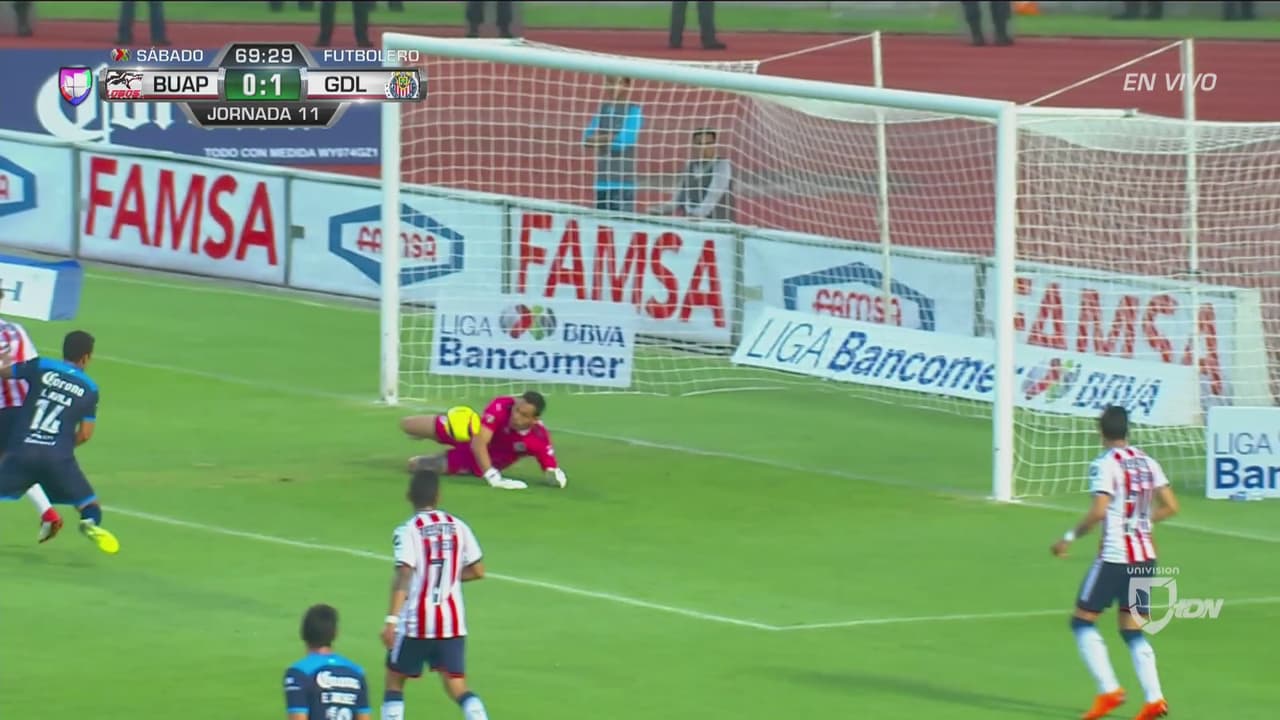 Amaury Escoto remató de zurda dentro del área, y el portero del Guadalajara tapó en dos tiempos para evitar el gol del empate de Lobos BUAP.