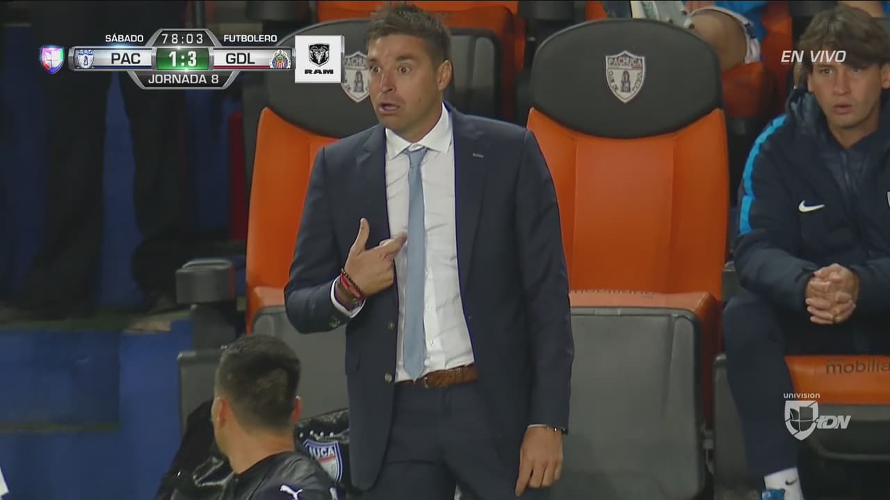 El DT de Pachuca explotó y jaló a Michael Pérez cuando la pelota estaba fuera de la cancha lo que le valió la expulsión y comenzar un connato de bronca.