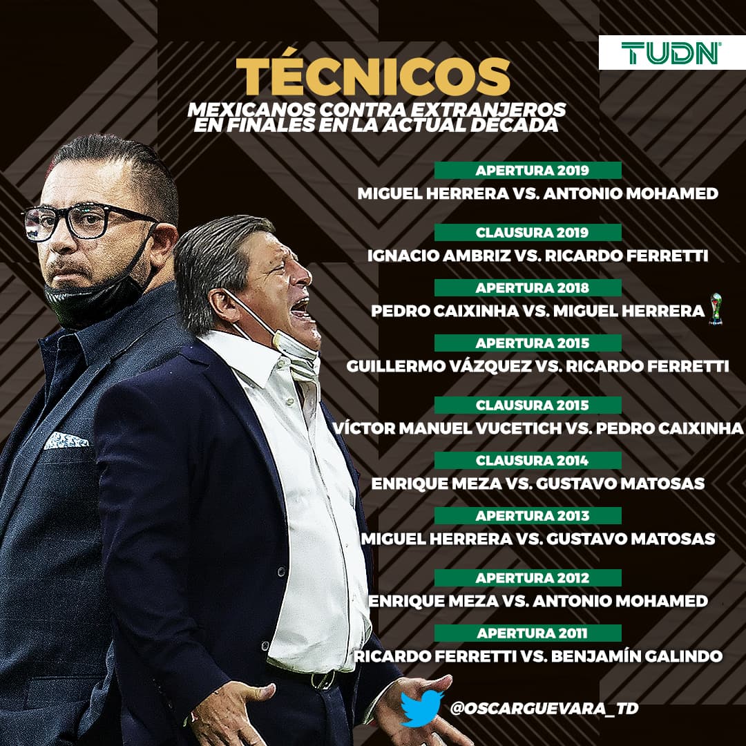 El propio Miguel Herrera perdió dos finales ante estrategas foráneos: en el Apertura 2013 contra Gustavo Matosas y en el Apertura 2019 contra Antonio Mohamed. Ignacio Ambriz perdió también una, la del Clausura 2019 ante Ricardo Ferretti.