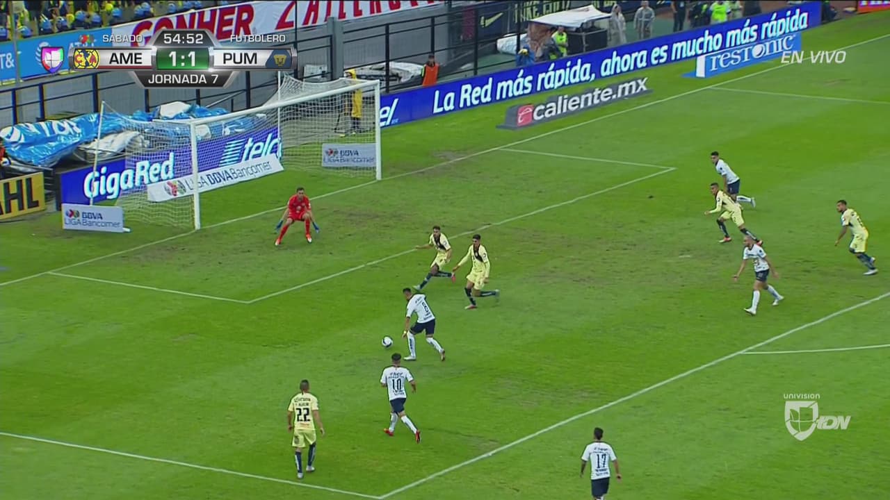 El volante de Pumas recibió solo en el área, recortó y luego sacó un disparo que la defensa tapó de gran forma.