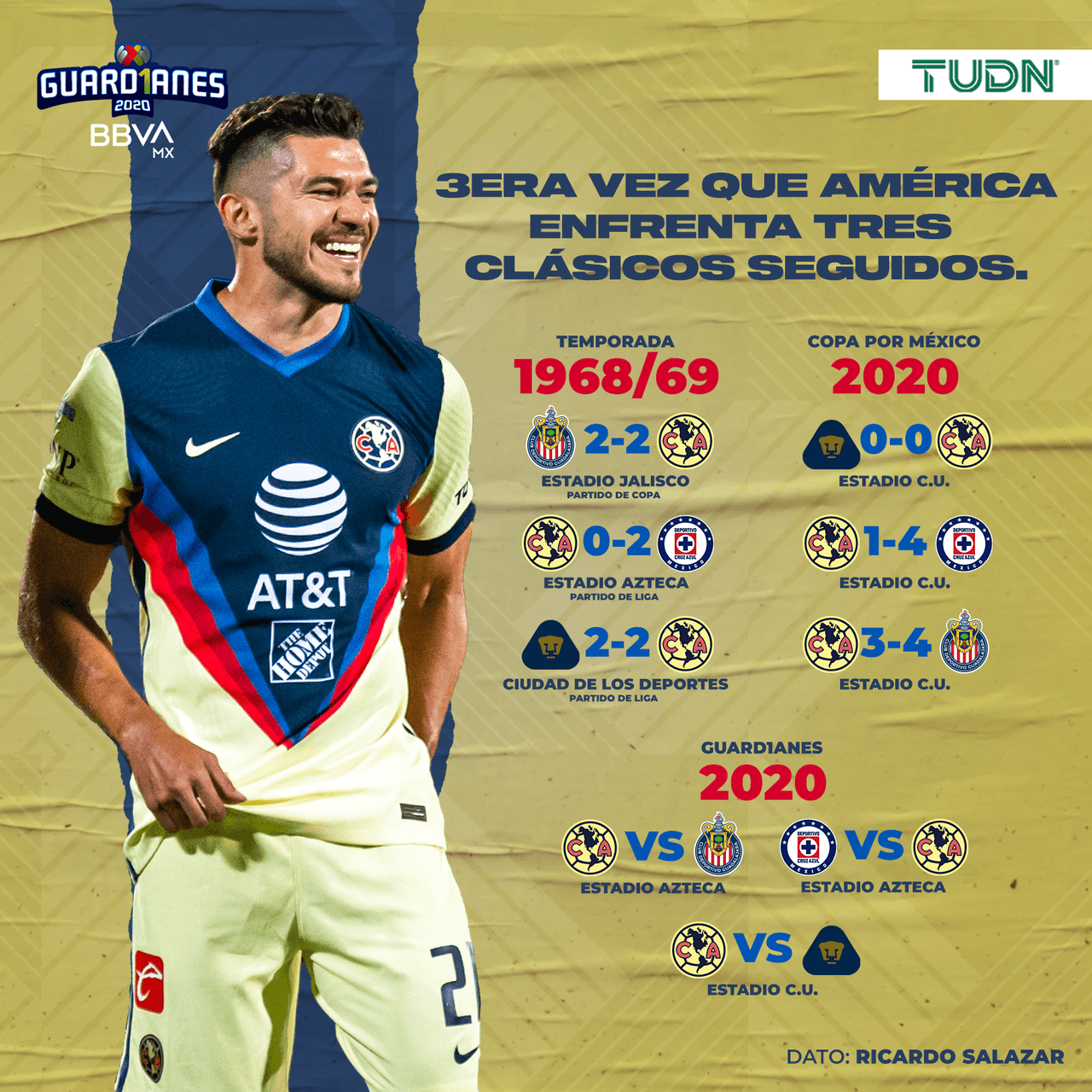En el actual campeonato de liga Guard1anes 2020 BBVA MX, el América enfrentó al Toluca (1-1) y se prepara para encarar los 3 ‘clásicos’, a partir de la jornada 11; el orden será el mismo que en 1968: Guadalajara, Cruz Azul y Pumas, esperando ganar por primera alguno de ellos.