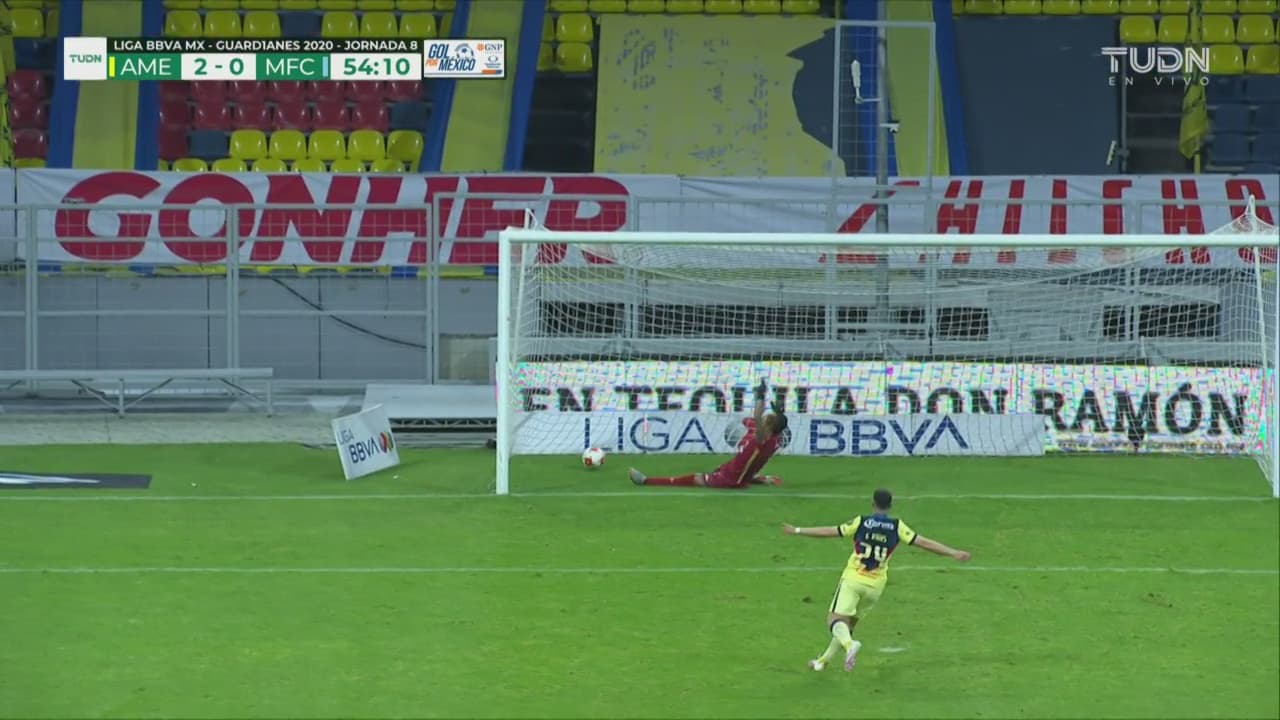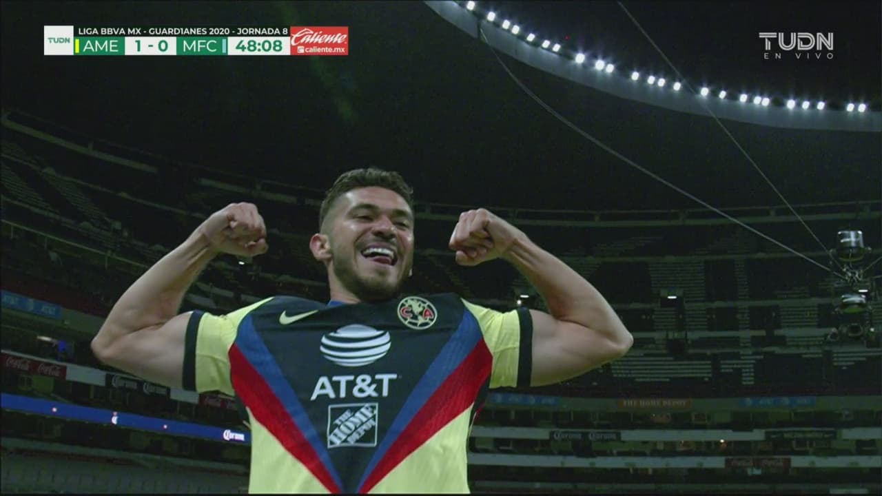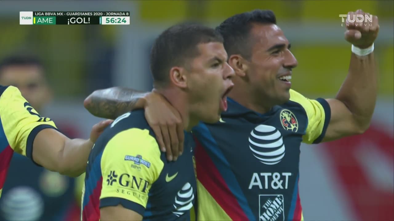 Asistencia exquisita de Jorge Sánchez que metió un gran pase al hueco, justo detrás de la defensa para que Henry Martín sacara un zapatazo cruzado y abriera el marcador con el considerado gol de vestidor en favor del América.