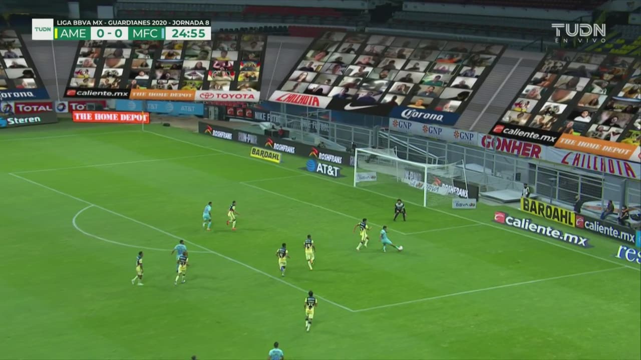 La respuesta del América vino en los pies de Sebastián Córdova pero el canterano no pudo cambiar ese zapatazo por gol para el equipo de Coapa que veía cómo se desperdiciaba una jugada de gol.
