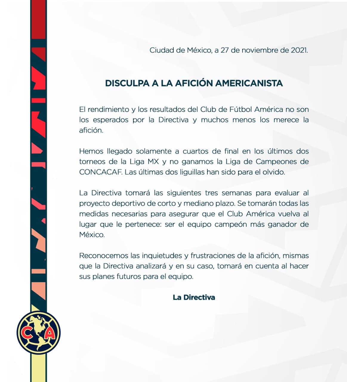 “La Directiva tomará las siguientes tres semanas para evaluar el proyecto deportivo de corto y mediano plazo. Se tomarán todas las medidas necesarias para asegurar el que Club América vuelva al lugar que le pertenece: ser el equipo campeón más ganador de México”, indicó el comunicado oficial de las Águilas que difundieron en sus redes sociales.